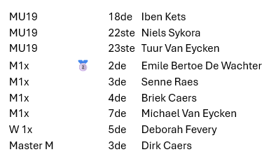 Bij de senioren won de ervaring van Emile het van de kracht van Senne en Briek. Emile kon met een sterke prestatie ook aanspraak maken op het zilver. Michael deed als Master mee in de open categorie zette een mooie prestatie neer. En ook Dirk Caers beleefde een nostalgisch moment in Seneffe, hij nam in zijn jeugd al deel en waagde dit jaar opnieuw zijn kans, dit maal bij de masters.
